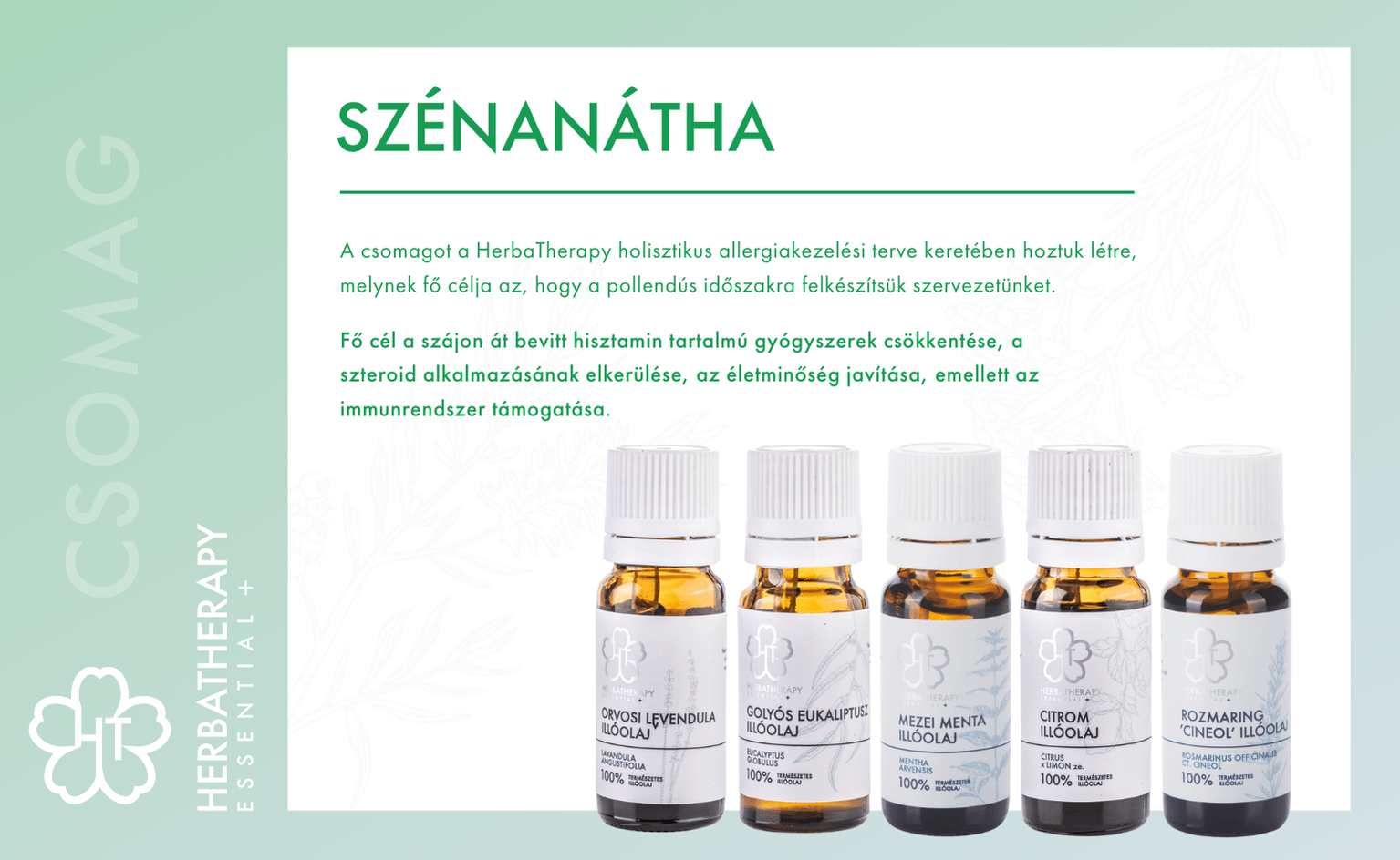 A csomagot a HerbaTherapy holisztikus allergiakezelési terve keretében hoztuk létre, melynek fő célja az, hogy a pollendús időszakra felkészítsük szervezetünket. Fő cél a szájon át bevitt hisztamin tartalmú gyógyszerek csökkentése, a szteroid alkalmazásának elkerülése, az életminőség javítása, emellett az immunrendszer támogatása.