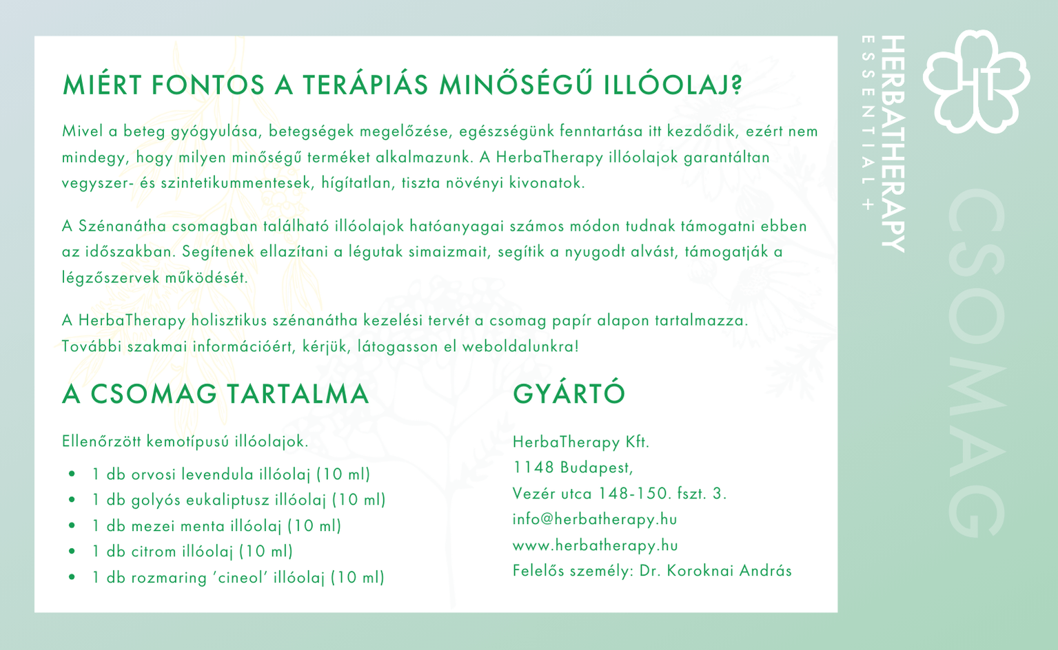 A Koroknai Medical Kft. (HerbaTherapy márka) nem vállal felelősséget bármilyen, a jelen internetes oldalon található információk alapján történt öngyógyítás során bekövetkezett balesetért, sérülésért vagy károsodásért.